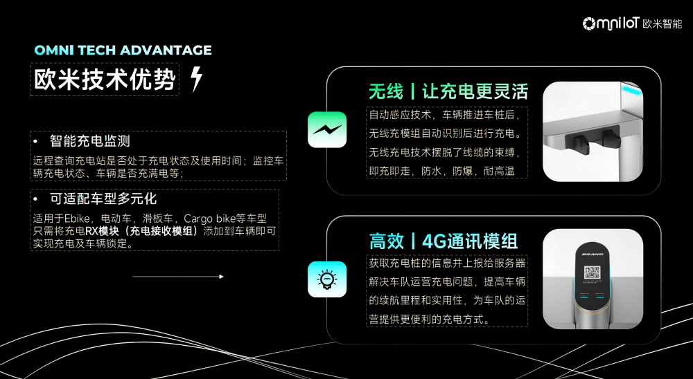 :歐米智能無線充電樁采用磁共振無線充電技術,實現車輛智能無線充電系統,避免來回換電、集中充電等帶來的安全隱患,歐米無線充電樁充滿自動斷電、溫度檢測功能能有效做到充電安全管控及危險防范 成本:有效避免目前平臺運營,增加配置30%換電電池需求,平均每臺車降低600-1000元的固定成本 管理:目前平臺運營,集中換點,每天需要大量的來回調 度,增加成本的同時影響用戶騎行。采用無線充電樁,減少來回調度任務,同時采用線上任務模式,讓用戶自主還車到充電樁,獲得額外 獎勵等激勵形式